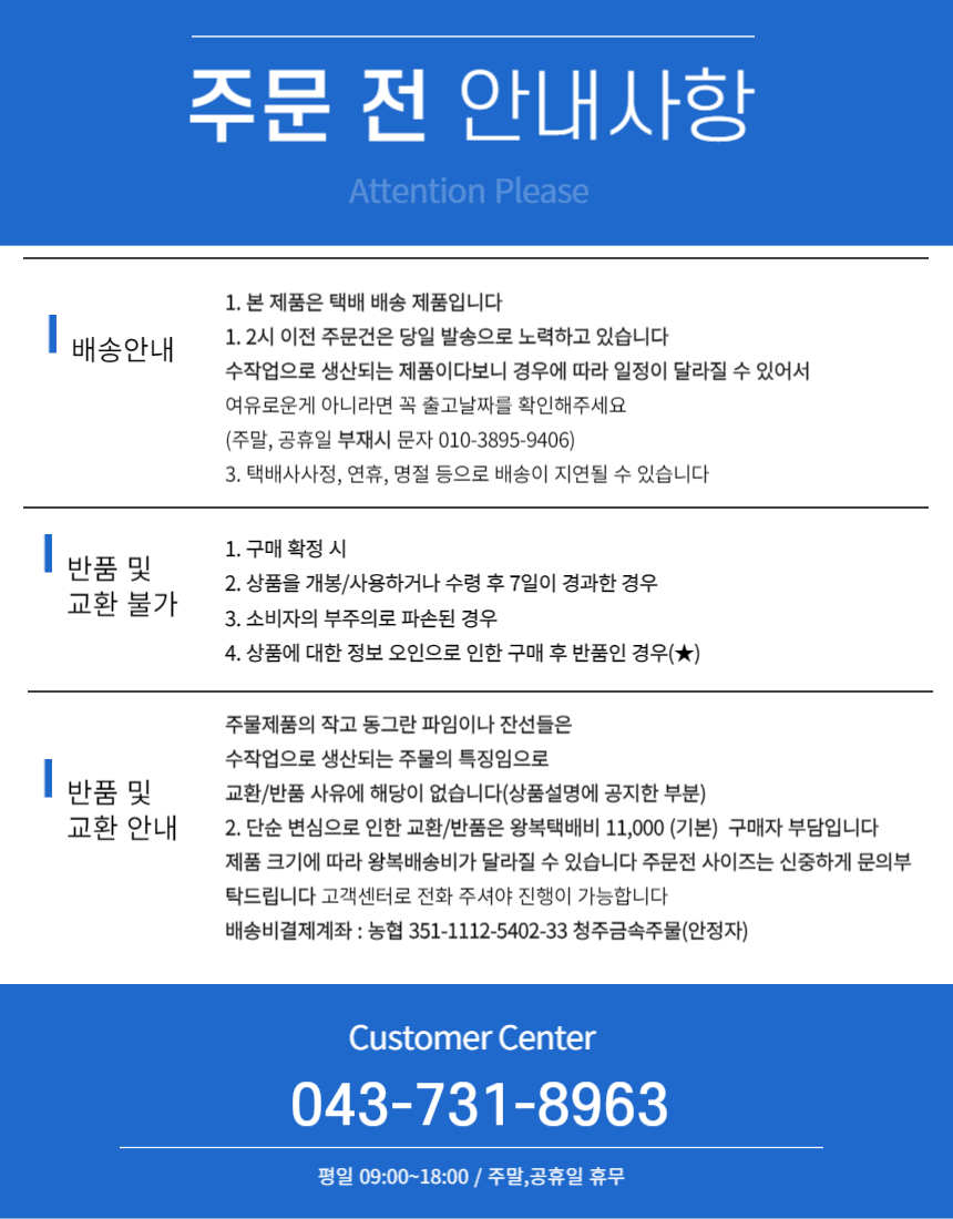 주문 전 충분한 사이즈 문의와 제품에 대한 문의를 부탁드립니다.